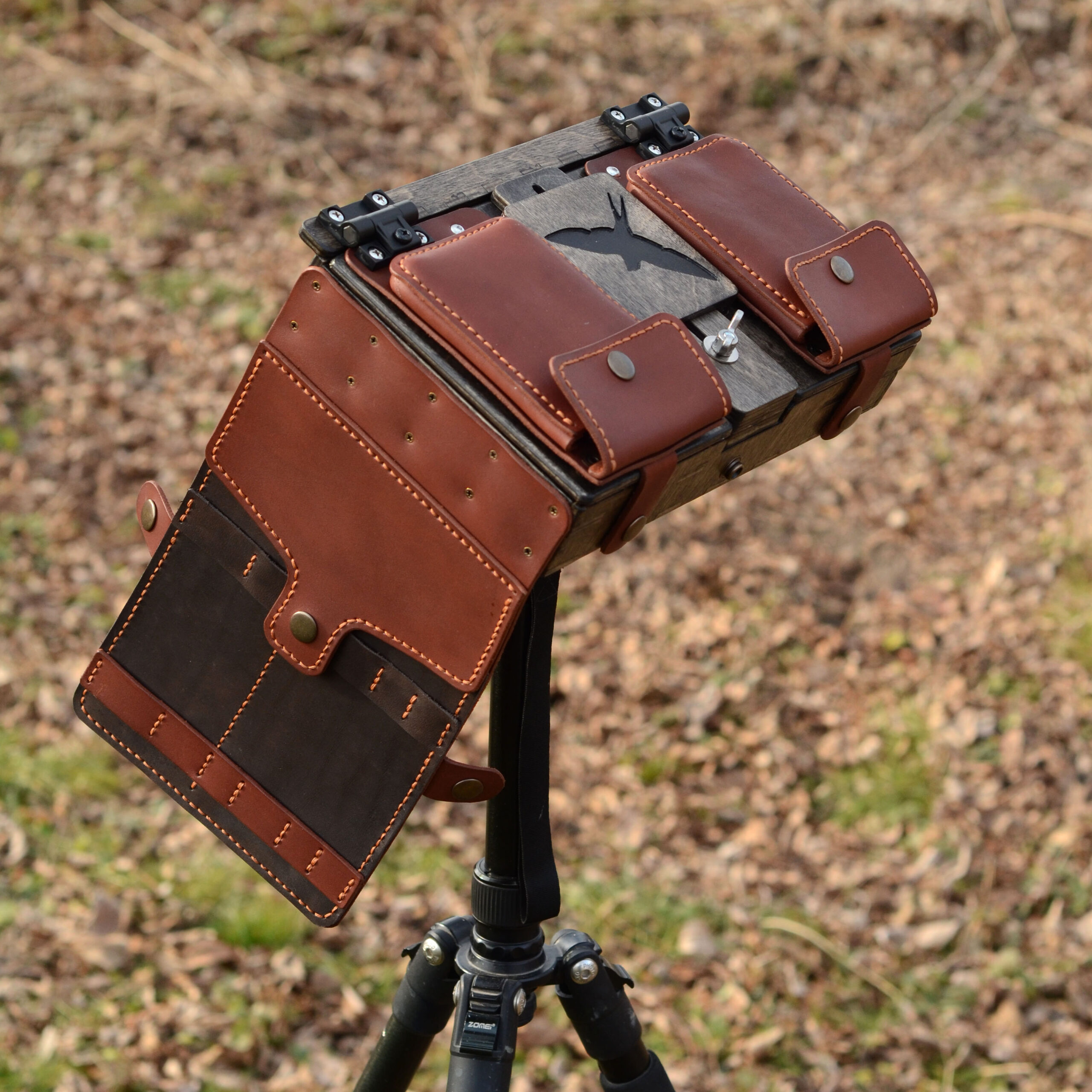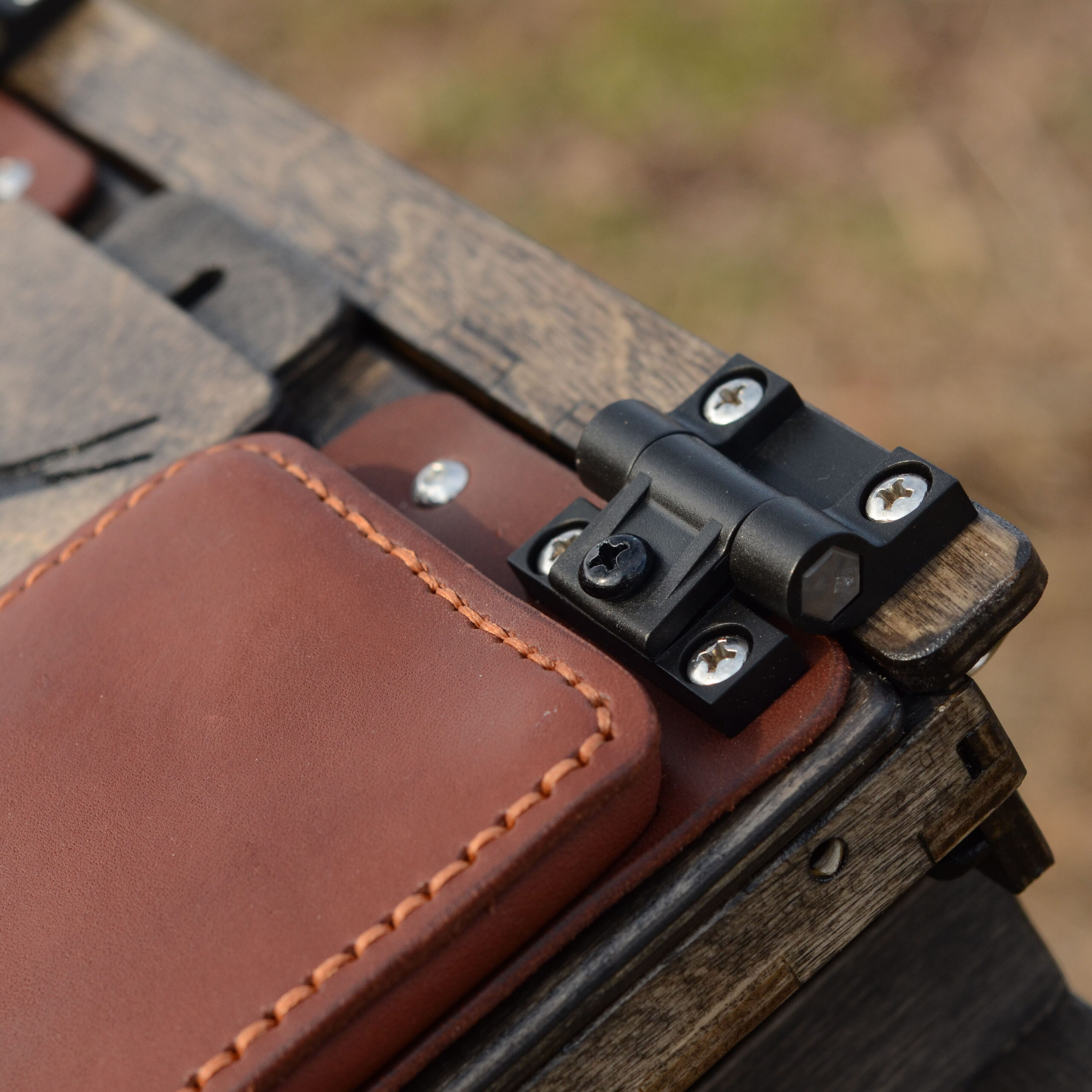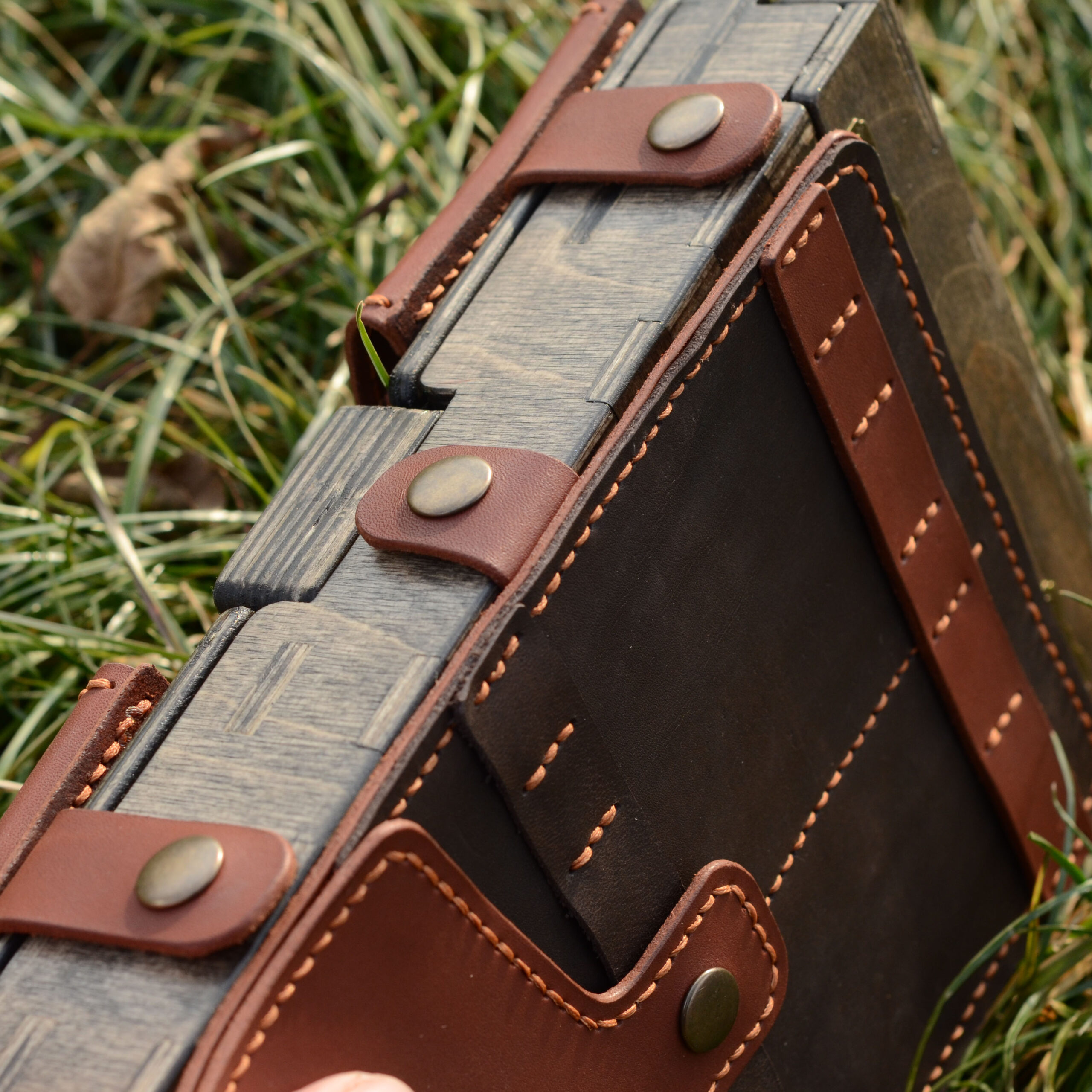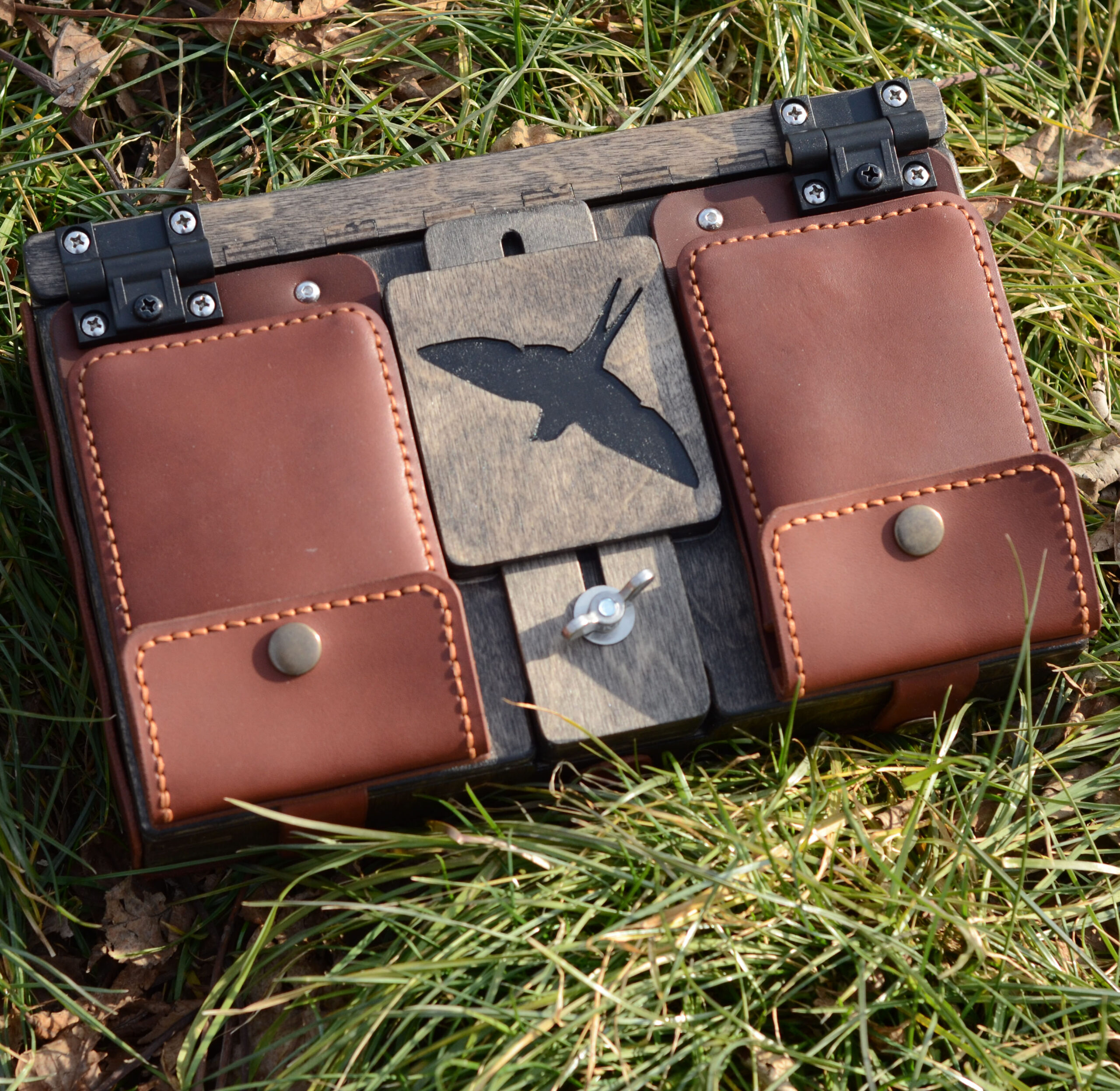 Materials: stained and varnished birch plywood box, genuine leather parts, tension hinges, metal details (screws, nuts, etc.)