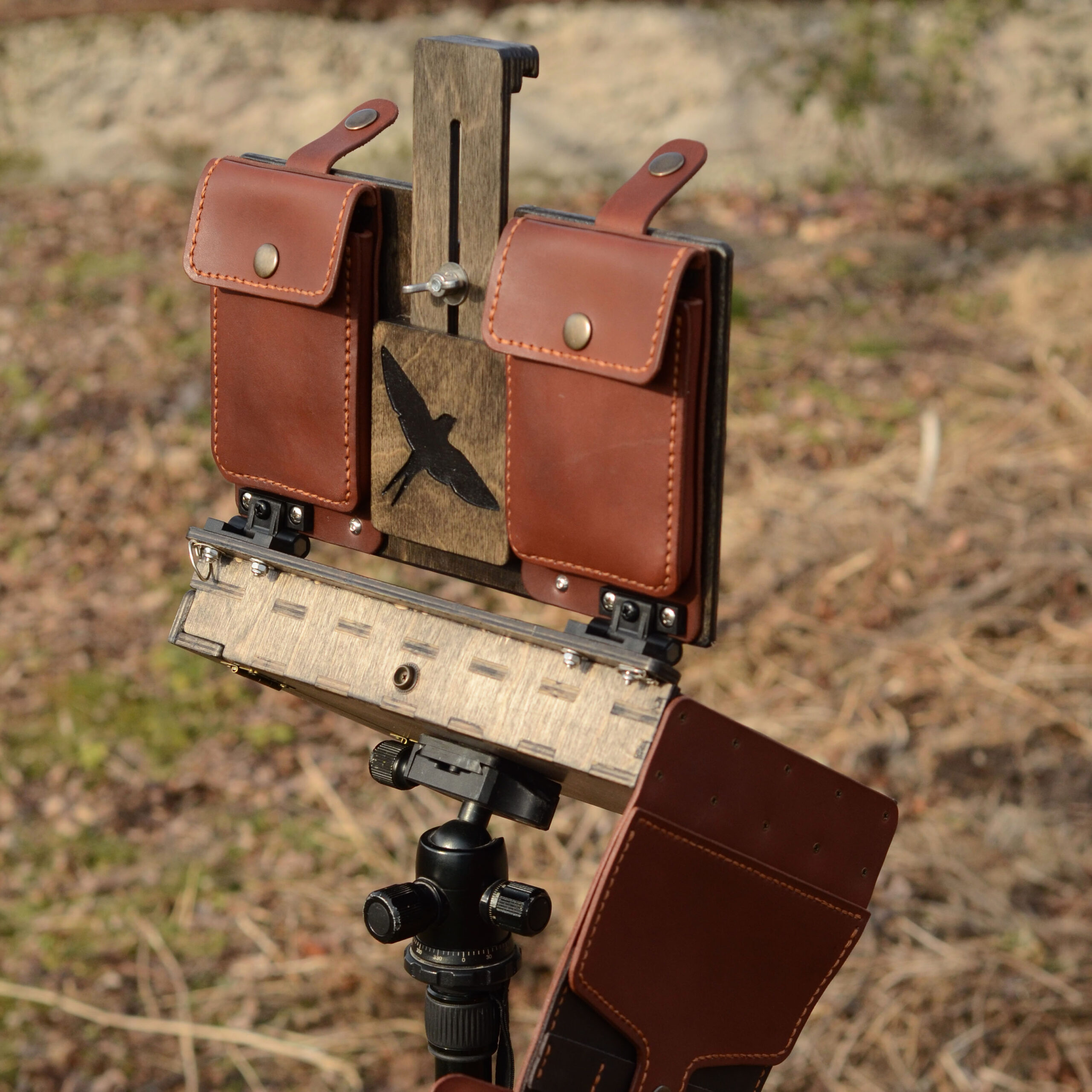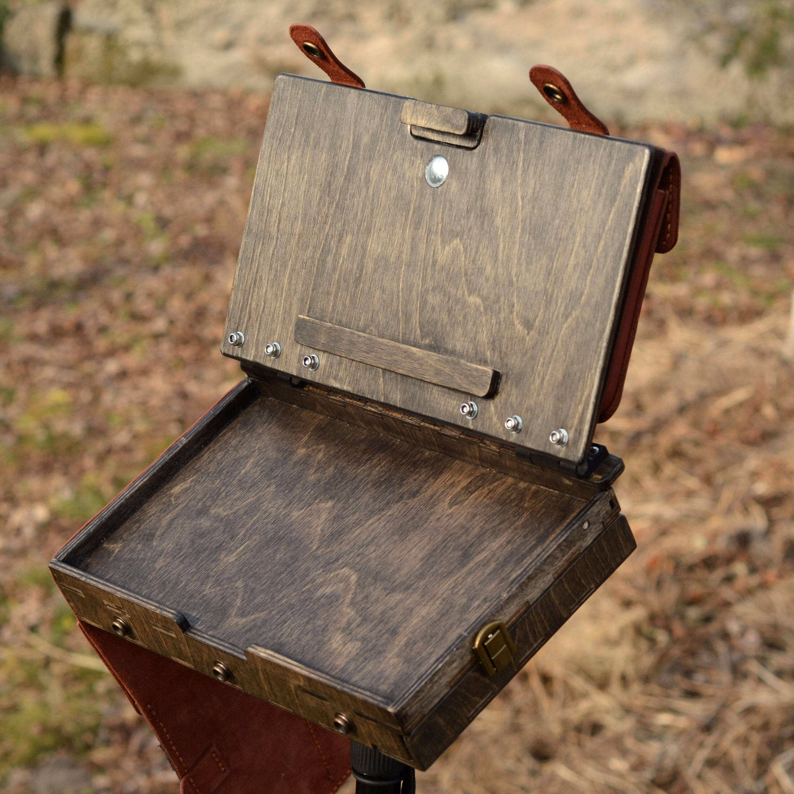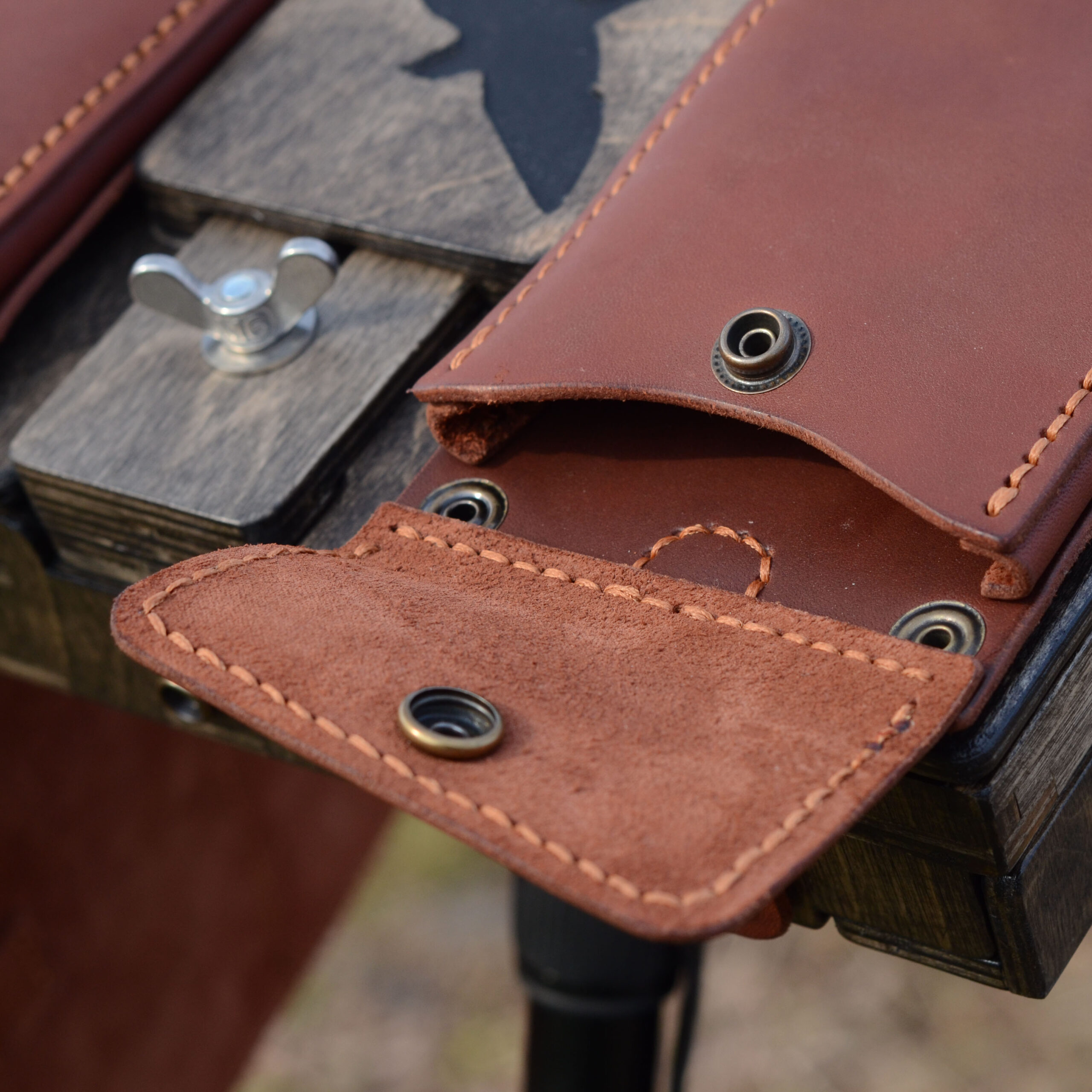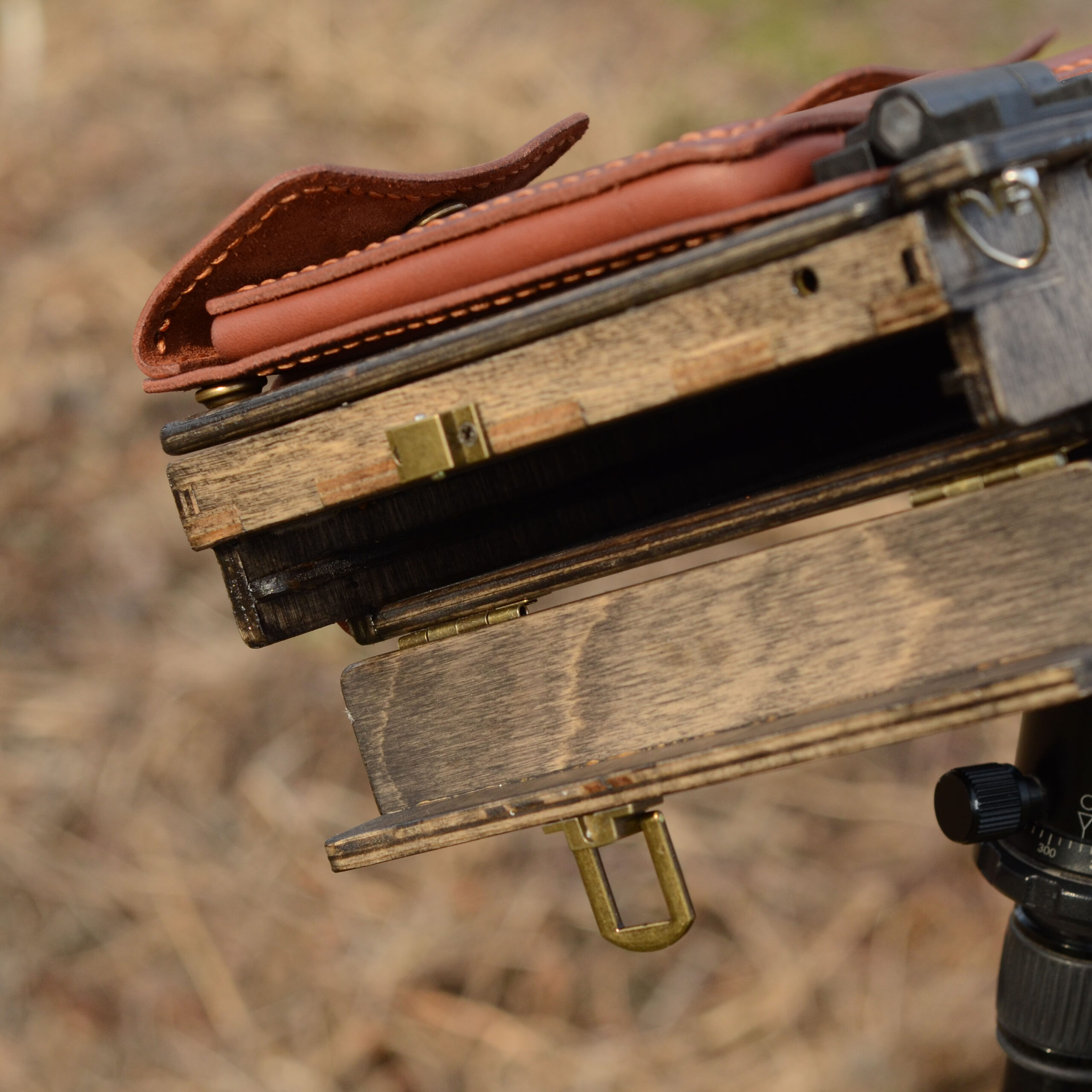 Materials: stained and varnished birch plywood box, genuine leather parts, tension hinges, metal details (screws, nuts, etc.)