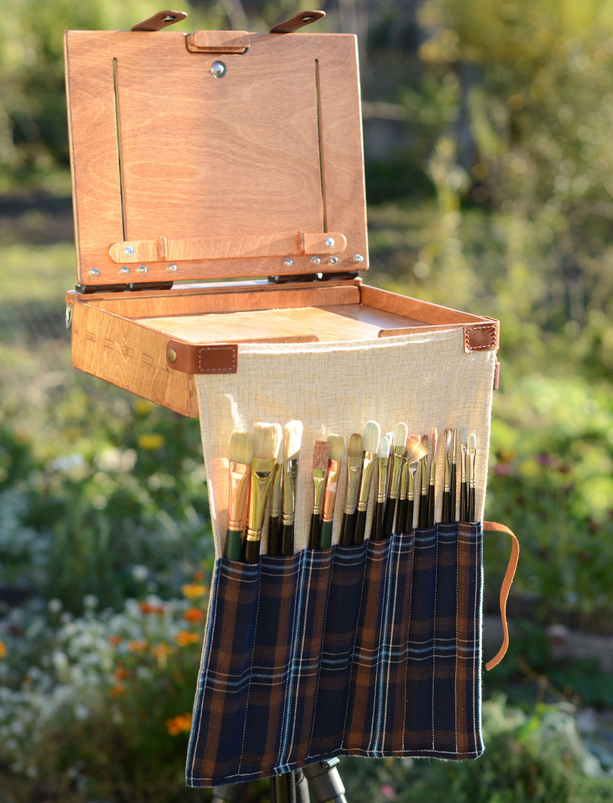Order it with your pochade box and I will make it fit. Please pick the approximate front width of your pochade box (12 inches for Martlet 10×12, 8 inches for watercolor 6×8 etc.). Will not fit on the hanging palette and watercolor easel for metal palettes.