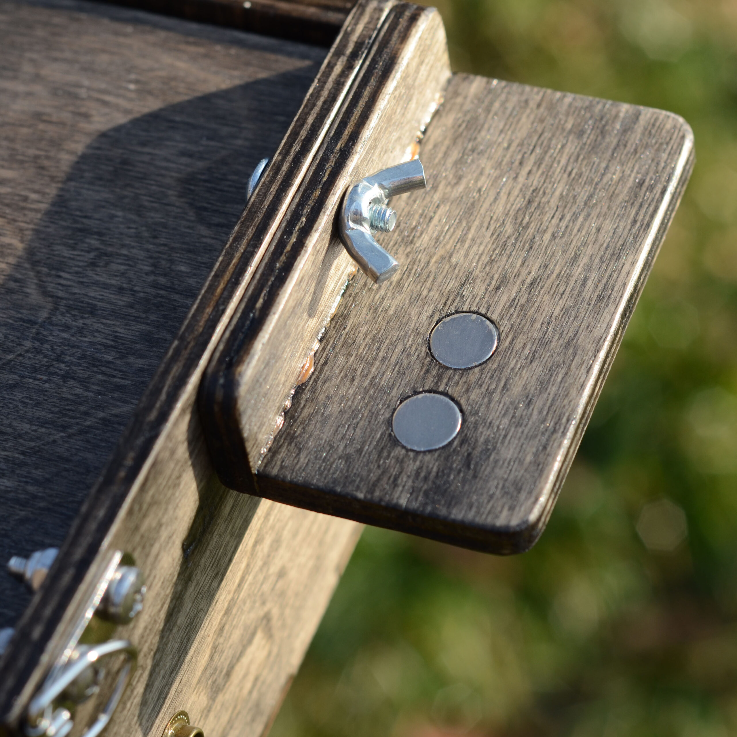A side tray for a pochade box to hold a dipper clip and a palette knife (on two magnets). A standalone part that mounts on the side of a pochade box with a screw and a nut.