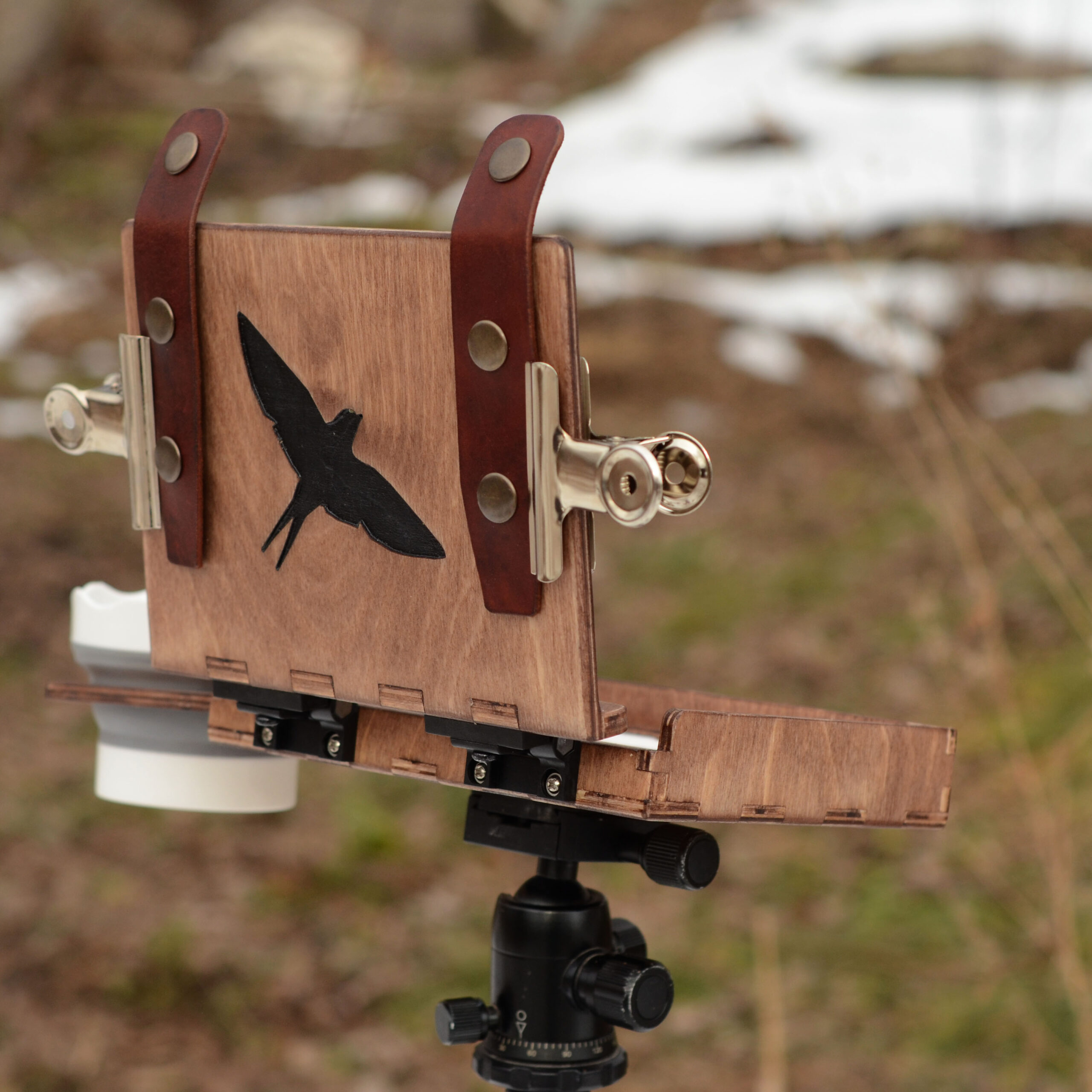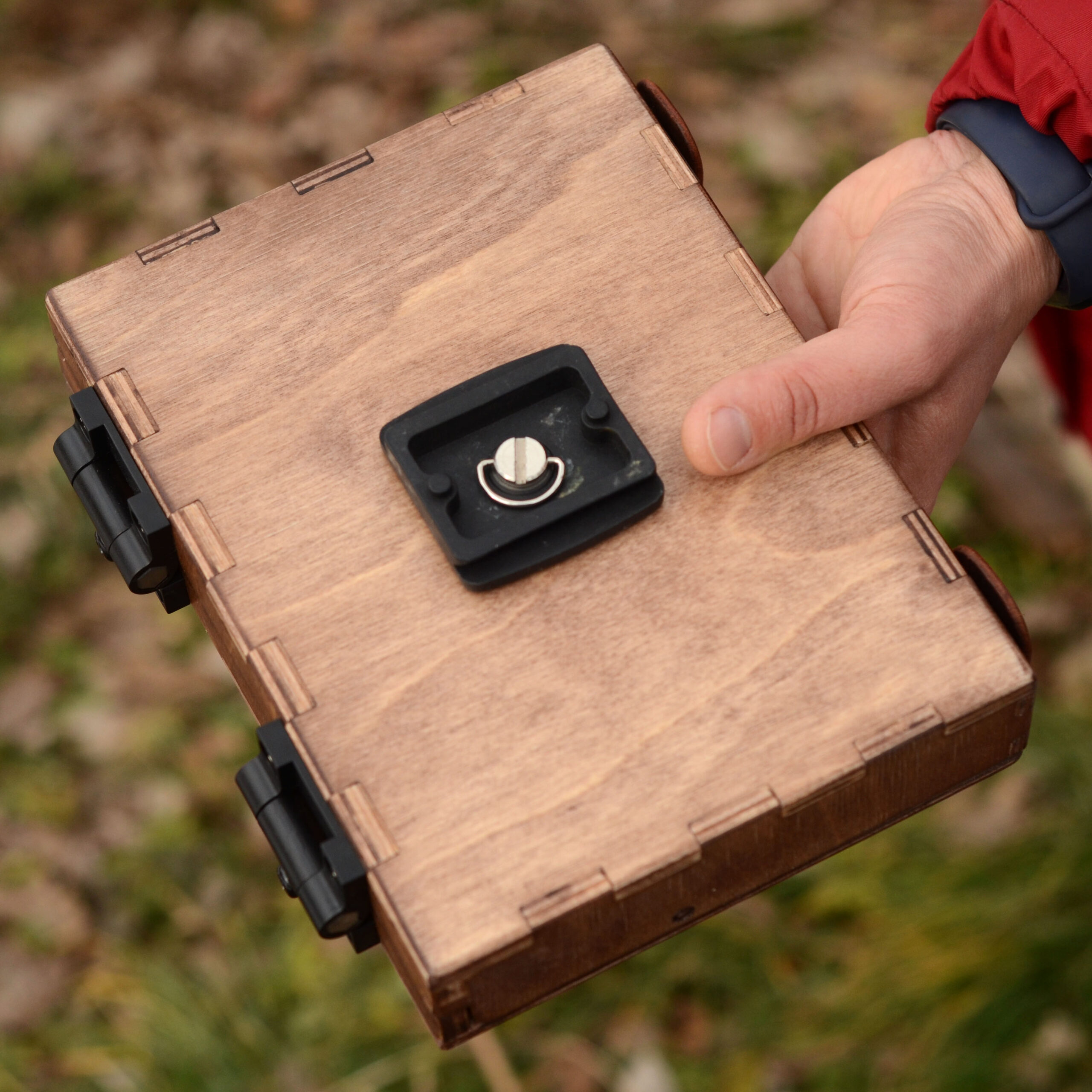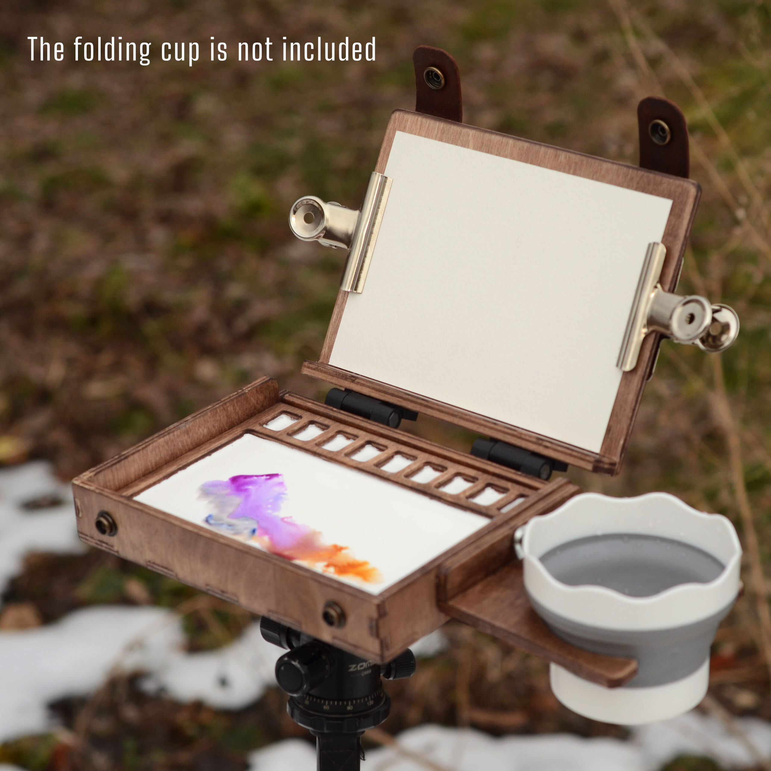 A little pochade with built-in watercolour cells and a palette works like a paint box to use on a table top or on a standard photo tripod with 1/4-20 UNC screw. Squeeze some paint into the cells and you’re ready to go!