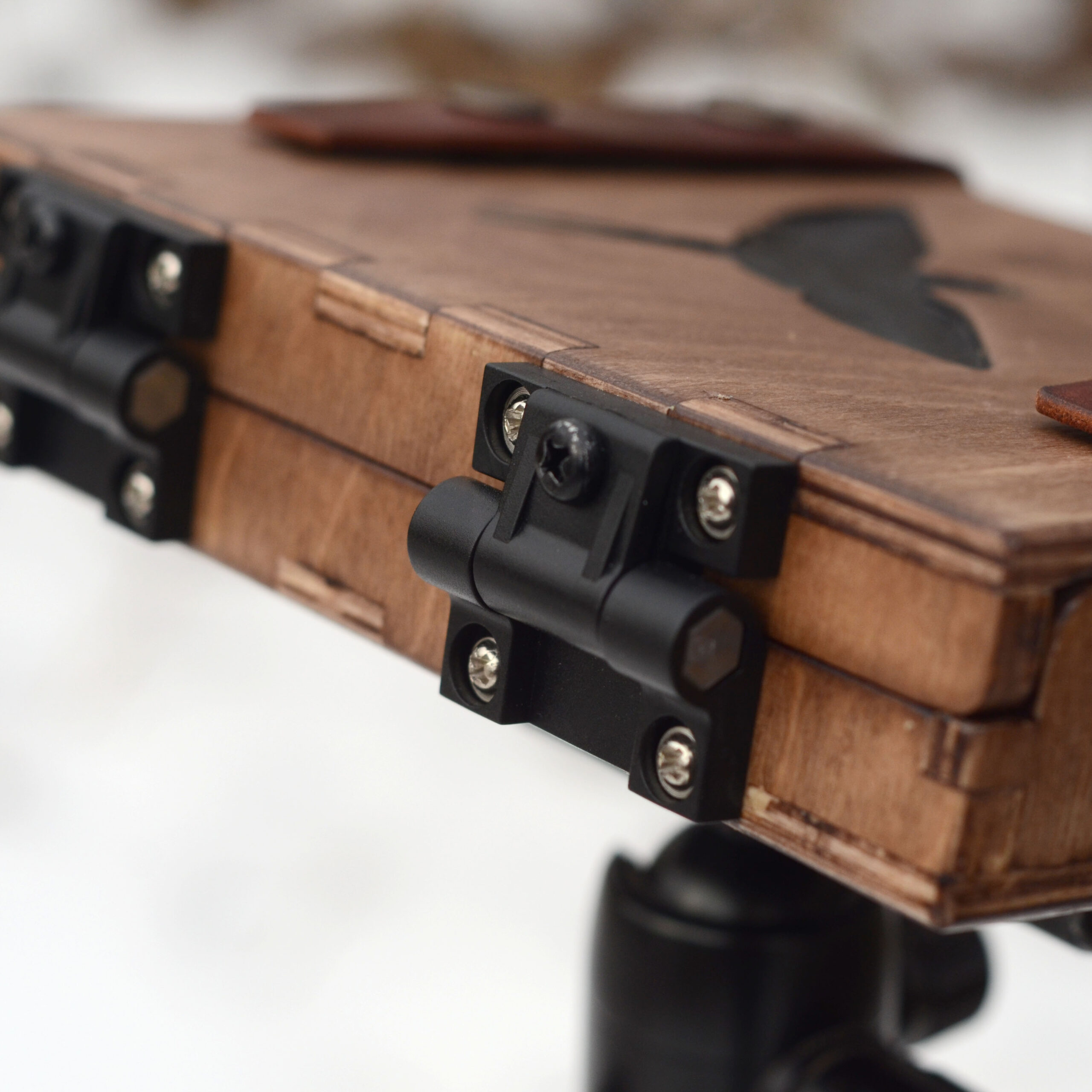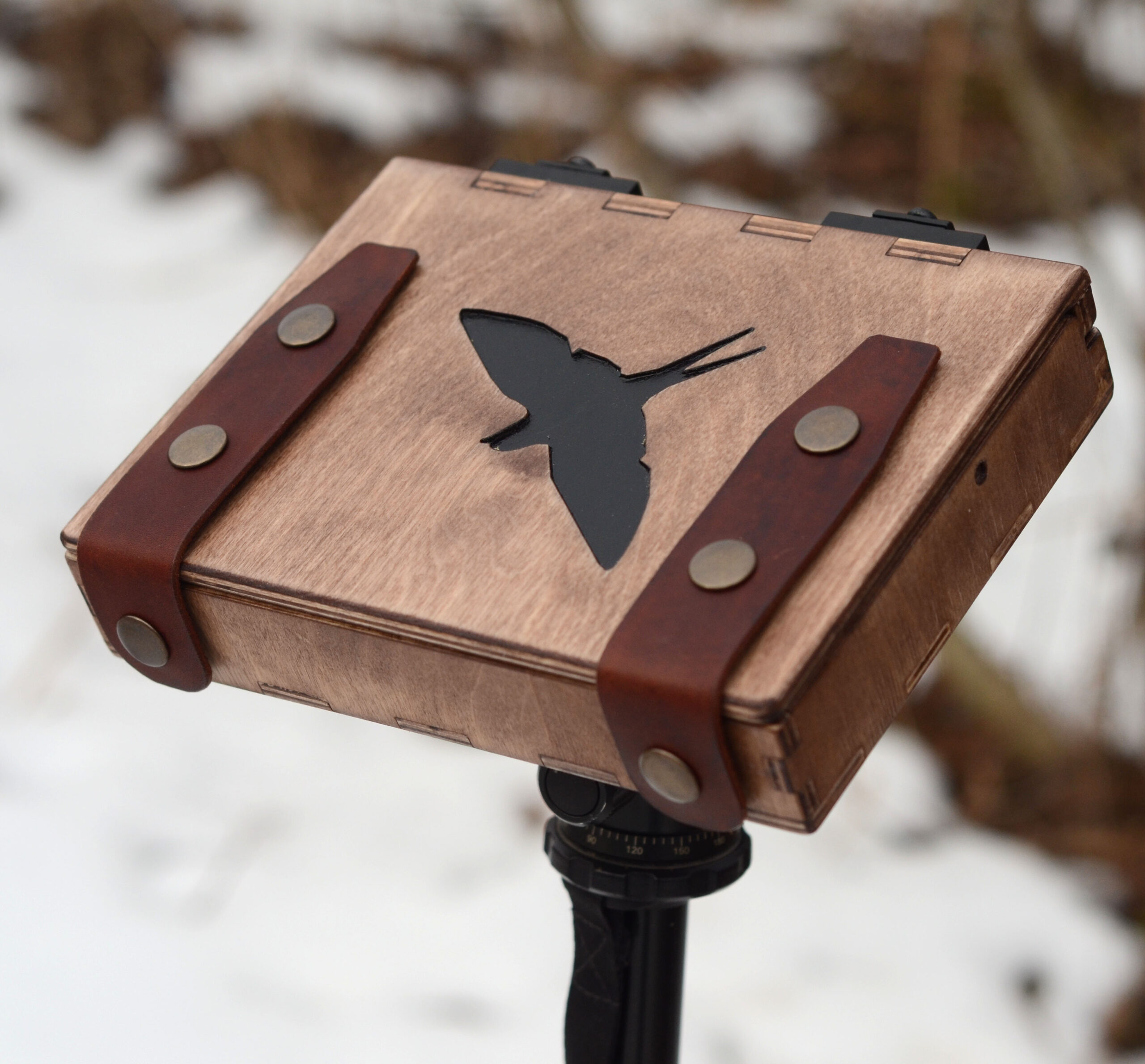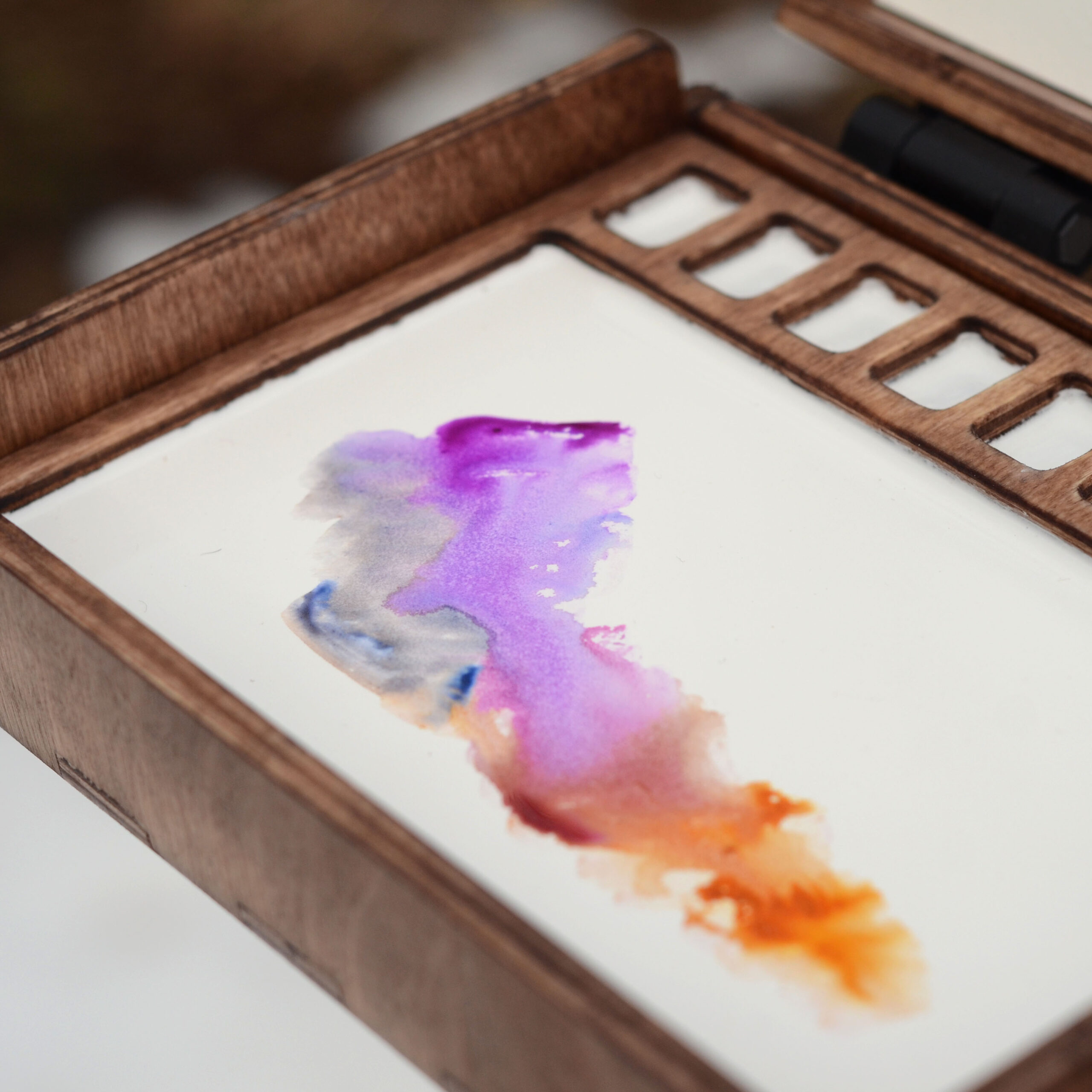 Has 9 watercolour cells. Materials: stained birch plywood (varnished), epoxy resin, geniune cowhide leather.